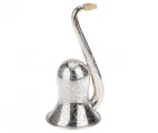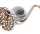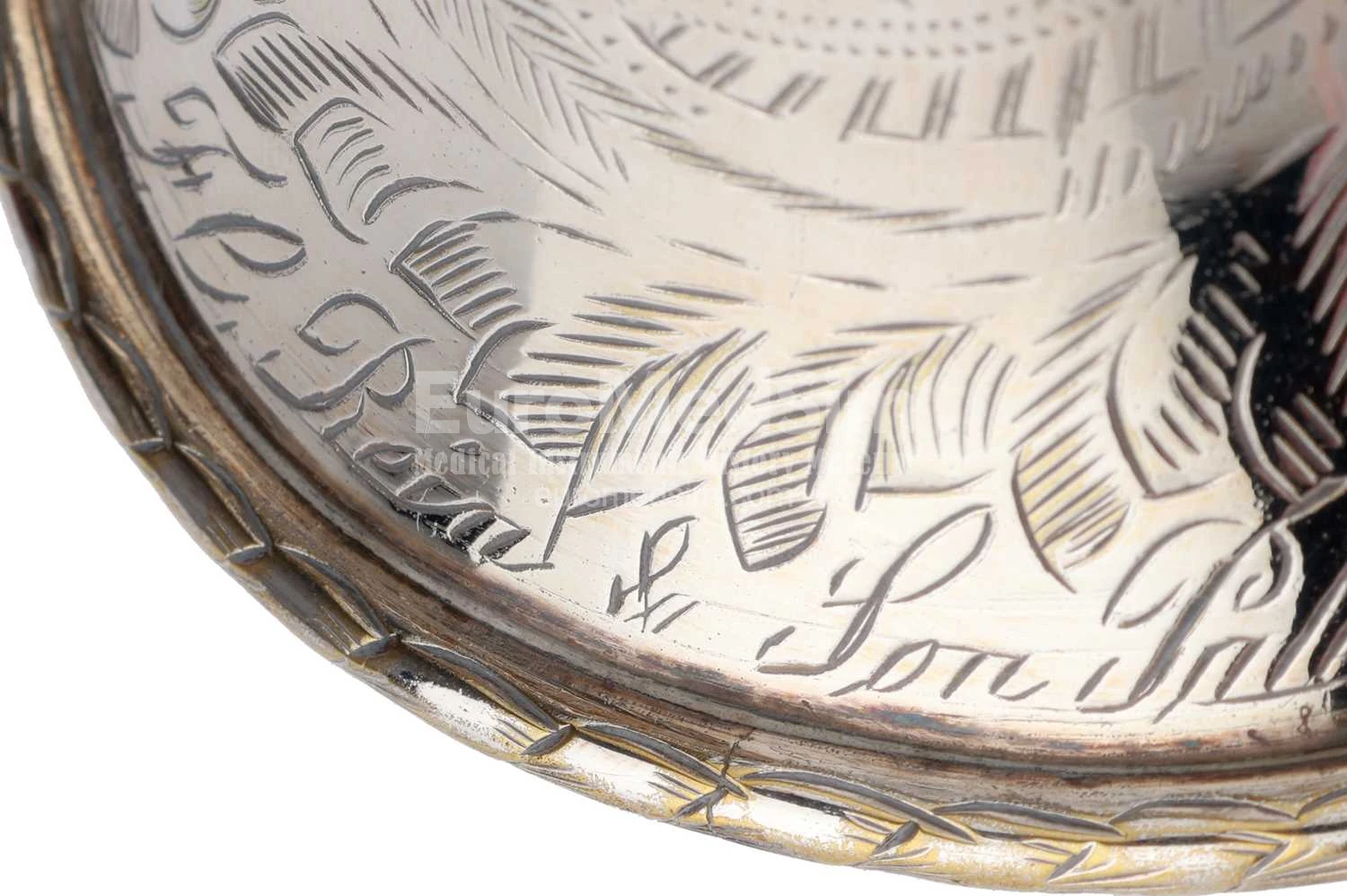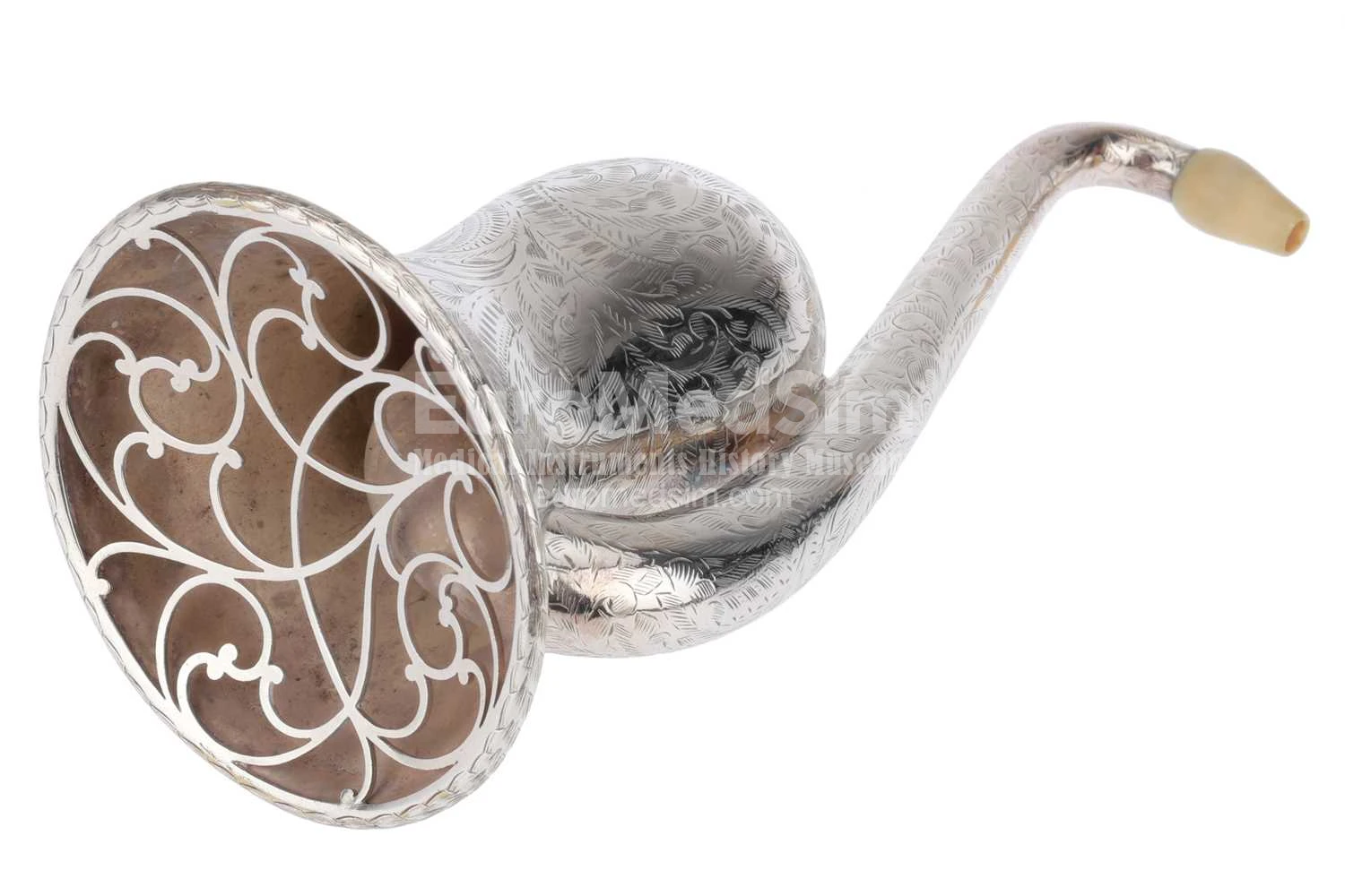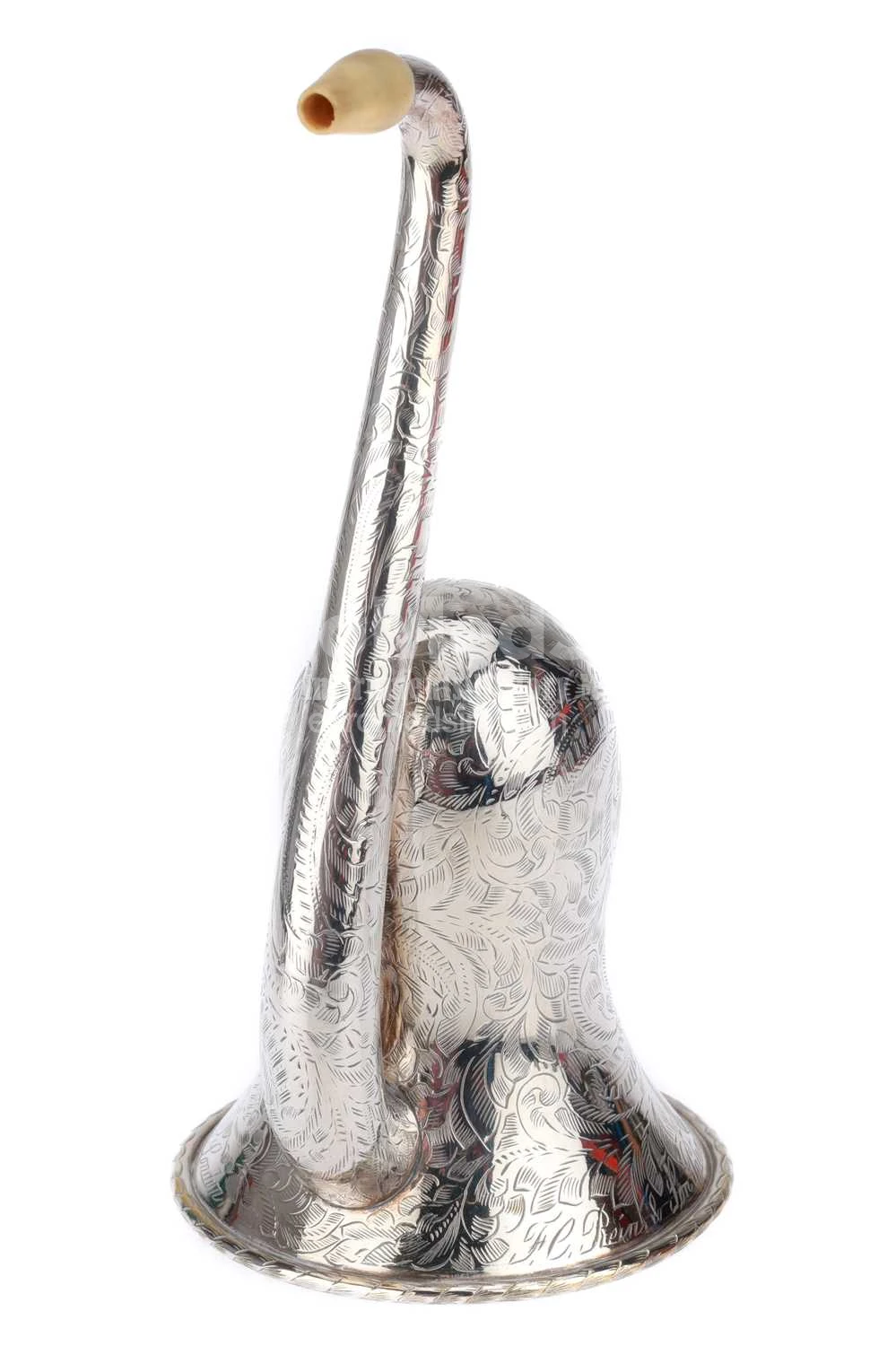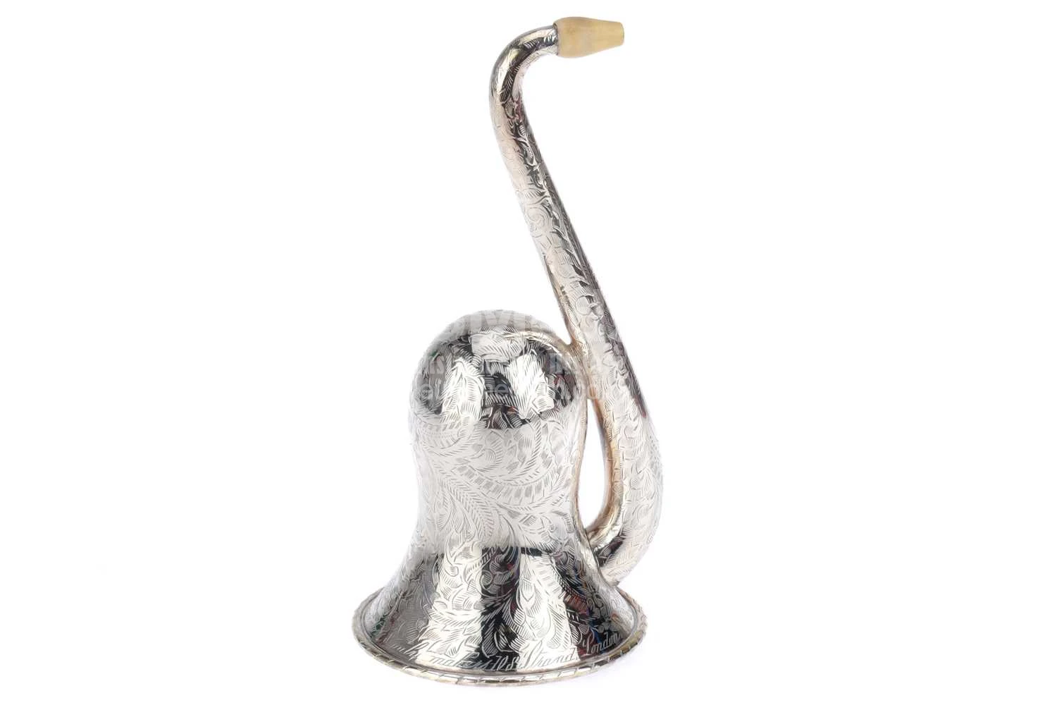 An elaborately-engraved plated white metal Rein & Sons Parabolic Bell Ear Trumpet Hearing Aid. English, ca. 1860. The bell-shaped earpiece ('London Dome') is coated in shiny white metal and adorned with intricate floral patterns across its entire surface. The curved earpiece is topped with a removable ivory earpiece (with a tiny crack). The opening of the wide trumpet part is featured by a decorative grille, also adorned with floral patterns. An inscription is engraved along the rim of the bell: F C Rein & Son, Patentees, sole inventors & only makers, 108, Strand, London.