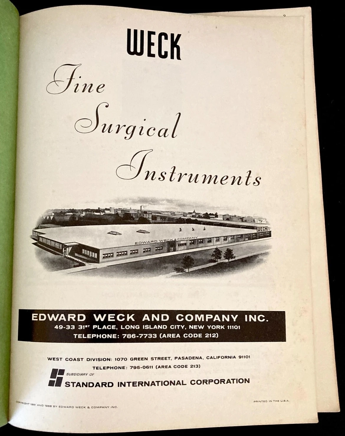 A major corporate change occurred in the late 1950s: sometime between 1956 and 1963, Edward Weck & Co. was acquired by the Standard International Corporation of Massachusetts [3]. 'Standard International' retained the Weck brand and likely provided capital for further growth. Under Standard’s ownership, Weck made a pivotal expansion of its product line in the early 1960s that would cement its reputation in surgical devices.
