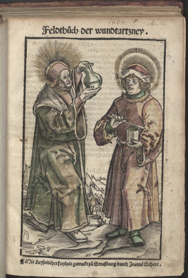 Hans von Gersdorff (ca. 1455-1529), Feldtbuch der Wundartzney (Field Book of Wound Medicine). The first edition the book was published by Johannes Schott, 1517 in German-speaking Straßburg (today's Strasbourg in France). Folio (262 x 192 mm), 42 lines plus headline, double column, Gothic type. Contains the full-page woodcut illustration of St. Cosma and Demian performing uroscopy on the title page, 27 woodcut illustrations in text (21 full-page and 6 in text) and 2 folding plates. Woodcuts are attributed to Hans Wechtlin.