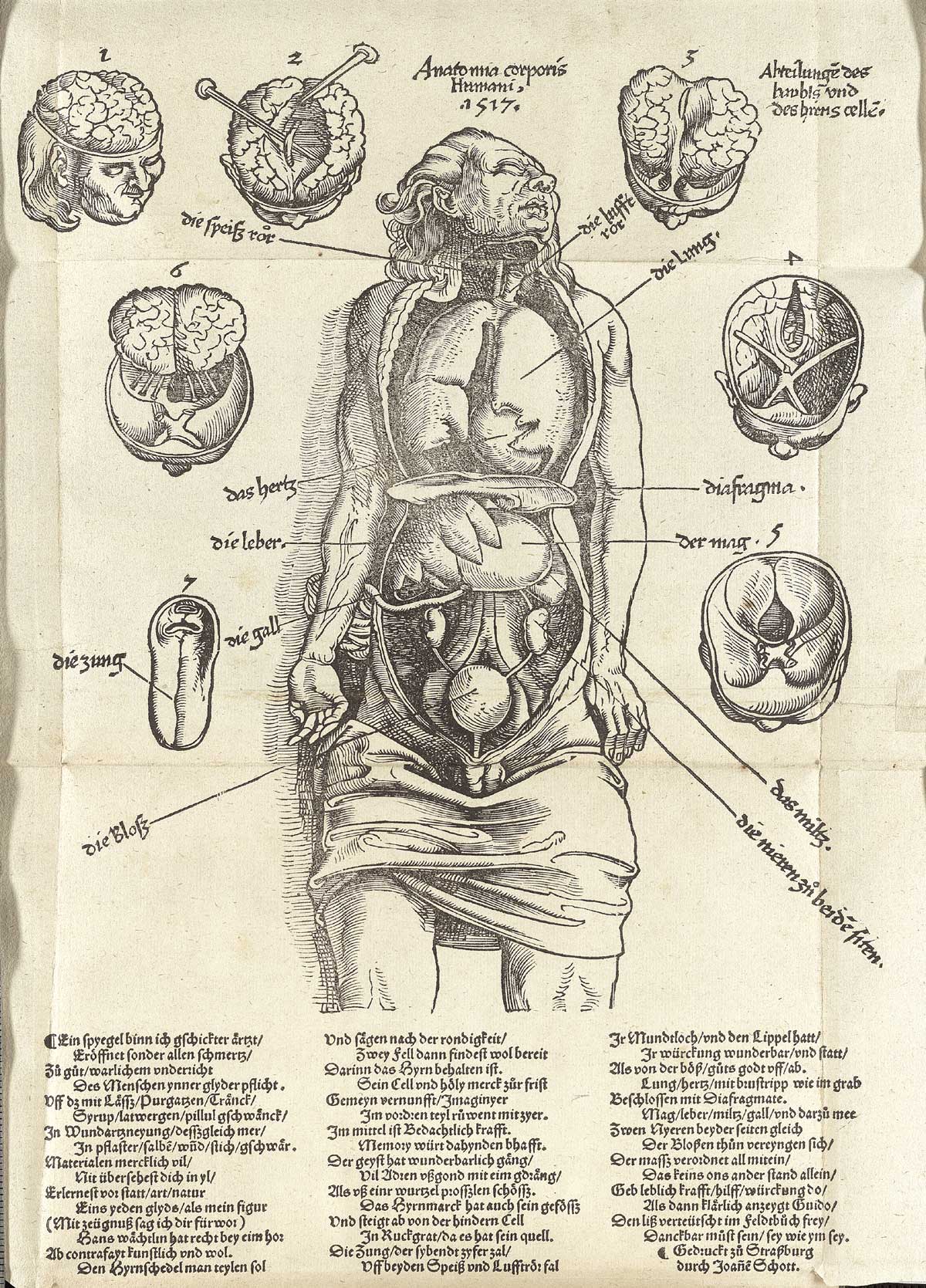 “Fugitive sheets (fliegende Blätter) with pre-Vesalian anatomy, representing whole figures with the names of the parts or explanatory texts, were published either on a single broadside or on two sheets, each with printing on one side only. In this period several appeared. They were generally intended to disseminate popular information, or to give instruction to barbers and surgeons, and were probably to be hung up in their anterooms. [...] They were, in the nature of things, predestined to be scattered and lost, and, on this account, are now all of them exceedingly rare” (Choulant-Franck, p. 156).