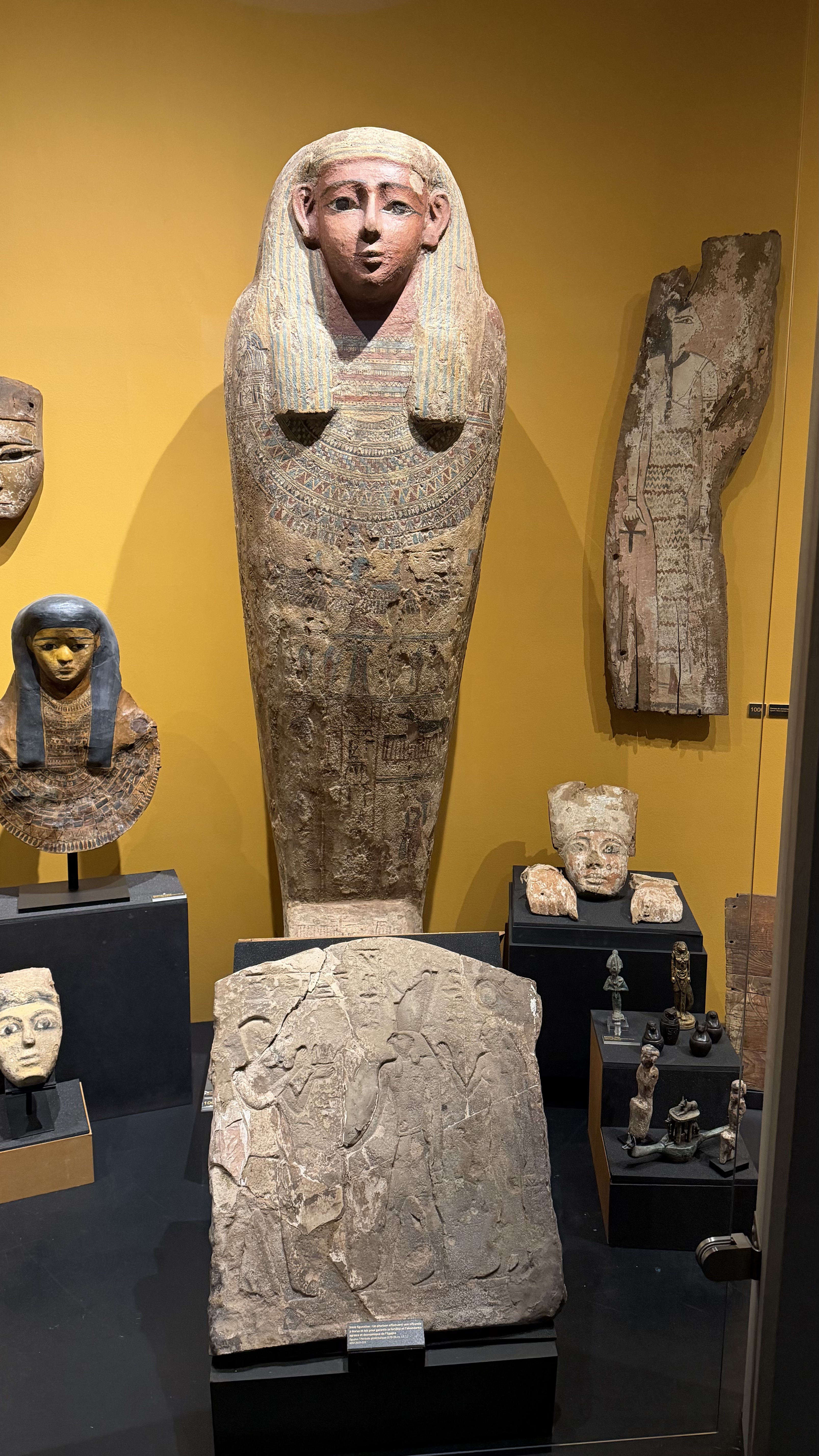 A sarcophagus from the 25th–26th Dynasty (around 625 BC, Late Period) features thin eyebrows, and the pectoral extends to the shoulders with two falcon heads crowned by solar discs. Lower down, Isis spreads her wings while the four sons of Horus surround an offering table with three loaves. Above on the right, Anubis the jackal-god appears with Thoth as a baboon in the solar disc. These illustrations refer to the ritual directed by Anubis, who brings the deceased by the hand before the scales where the heart is weighed against the feather of truth and justice. If the heart is not lighter than the feather, death is final.