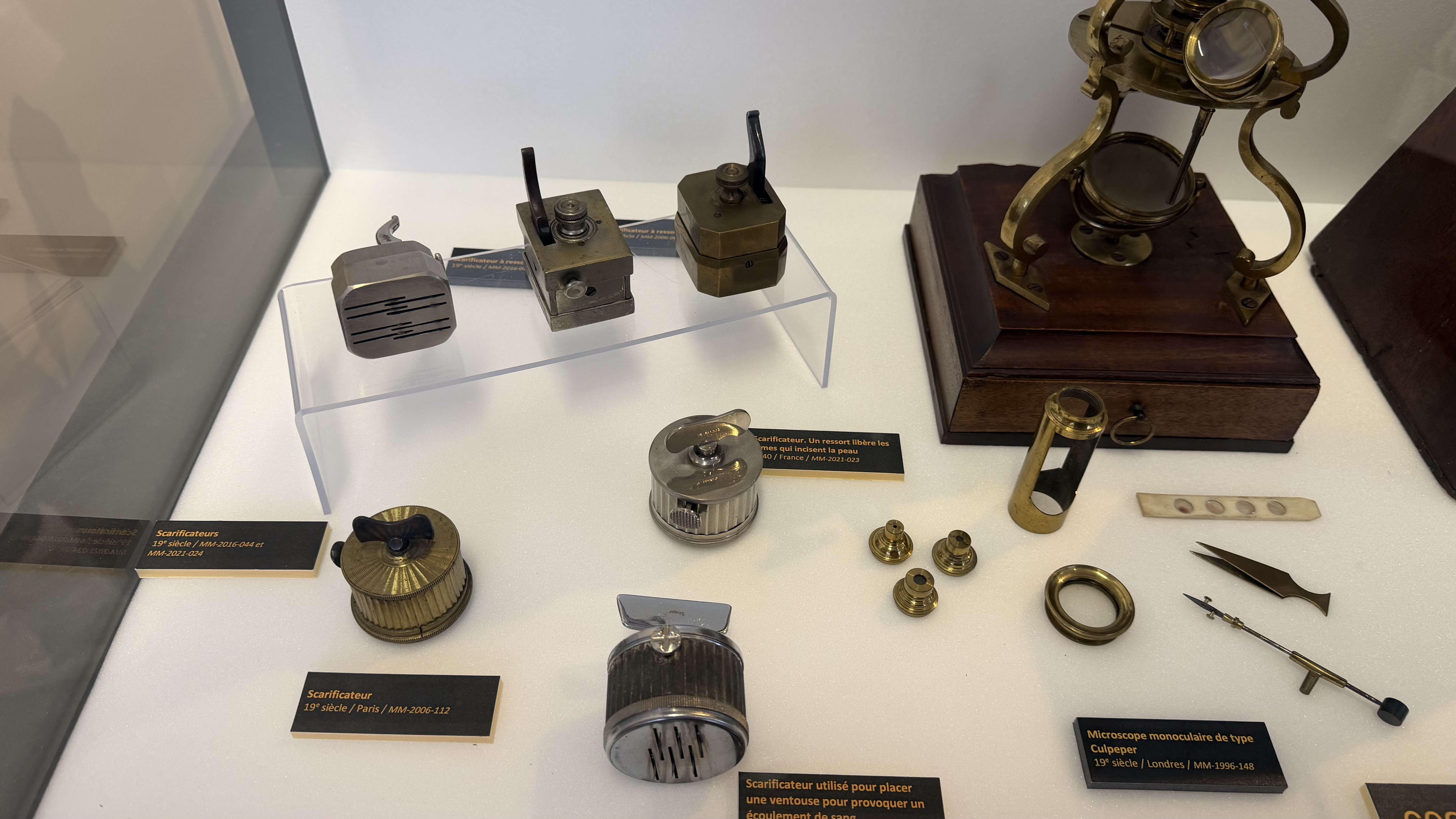 Trepanations were performed on patients suffering from skull fractures, convulsions, epilepsy, or psychiatric problems. The removed fragments were used as protective pendants. As the skull is relatively insensitive (unlike the scalp), this operation was relatively well tolerated. Cranial surgery was largely developed in the Middle Ages to remove the "stone of madness." Ambroise Paré used it to remove fragments of cranial fractures on the battlefield or to treat collapsed skulls. In the 19th century, it was used to drain abscesses. The kits shown include drill bits, files, lenticular knives, circular trepans, elevators, and so on. The anatomical wax in the center of the room represents a soldier wounded in the head during the Franco-Prussian War of 1870, on whom a trepanation is performed.